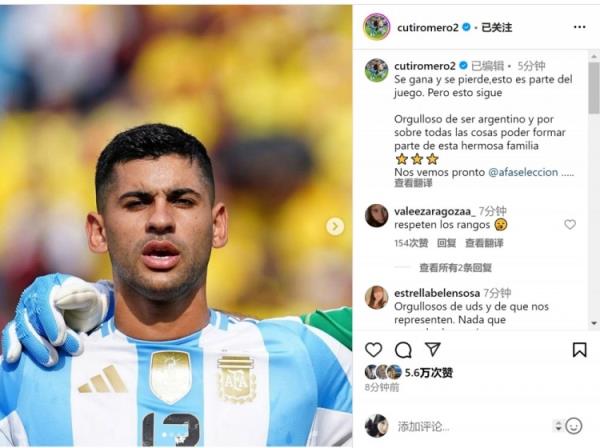 9月11日讯 在北京时间今天早上结束的南美世预赛中,阿根廷客场1-2不敌哥伦比亚。阿根廷中卫罗梅罗在社交媒体上晒出自己的照片,并写道:“有输有赢,这都是足球运动的一部分,但我们的征程还在继续。”“我为自己身为阿根廷人、最重要的是身为这个美丽大家庭的一员感到骄傲。回头见。 标签: 足球 阿根廷 热刺 英超