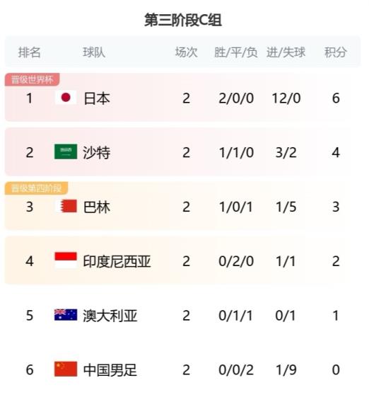 9月11日讯 18强赛C组第二轮结束,积分榜上,6支队伍几乎成了等差数列,只有领跑的日本多了一分,以6分领跑。中国队则在这个数列的尾部,中国队2轮0分,净胜球为-8。 标签: 中国队 国家队 中国男足 日本 中超 足球 中国足球