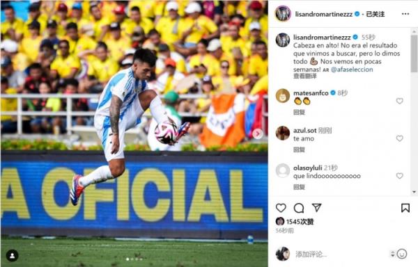 9月11日讯 在北京时间今天早上结束的南美世预赛中,阿根廷客场1-2不敌哥伦比亚。阿根廷后卫利桑德罗在社交媒体上晒出比赛照片,并写道:“抬起头来!这不是我们来到这里想要的结果,但我们已经拼尽全力。几周后见。” 标签: 足球 阿根廷 哥伦比亚 英超 曼联