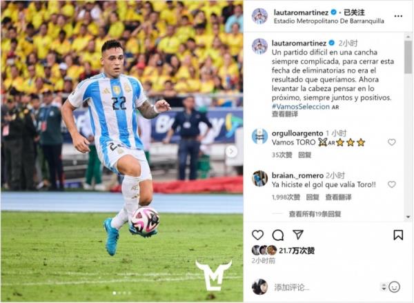9月11日讯 在南美世预赛第8轮比赛中,阿根廷客场1-2落败于哥伦比亚。阿根廷前锋劳塔罗在社交媒体上晒出自己的比赛照片,并写道:“在一个总是很困难的客场踢了一场艰难的比赛。我们本不想以这样的结果结束这轮世预赛。”“现在我们可以抬起头来考虑下一步,永远团结一致并保持积极的态度。加油阿根廷。” 标签: 足球 意甲 国际米兰 阿根廷 哥伦比亚